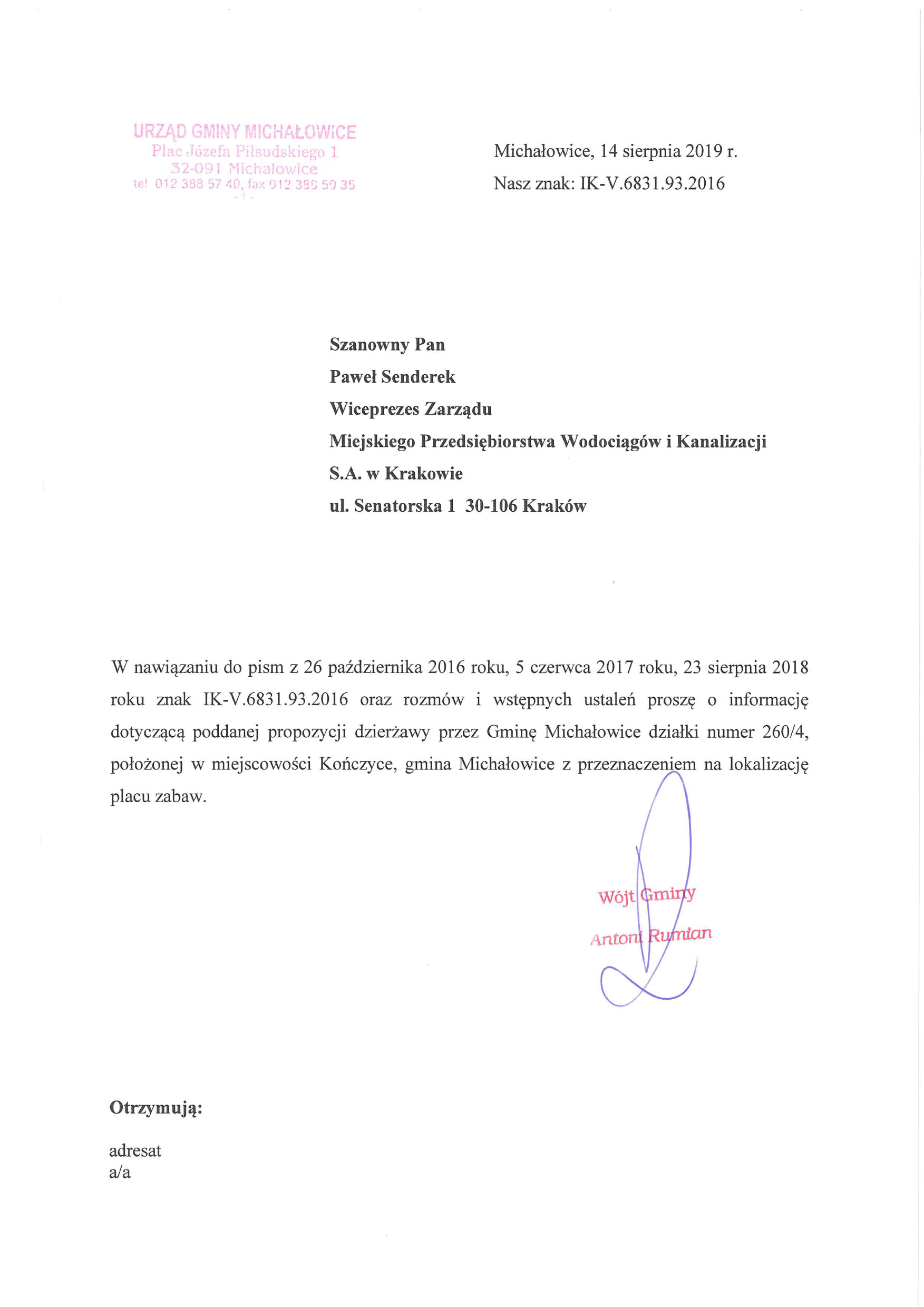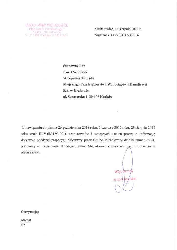 Jest to kolejne pismo w tej sprawie i mamy nadzieję, że tym razem sprawa zostanie rozstrzygnięta ostatecznie i pozytywnie co pozwoli Gminie w niedalekiej przyszłości zrealizować zamierzoną inwestycję, która poszerzy i uatrakcyjni tereny rekreacyjne w naszej wiosce.