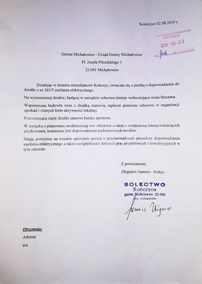 Po Rycerskich Dniach Dziecka widząc skale sukcesu wywołana oddolnym ruchem mieszkańców wioski Pan Wójt zaoferował pomoc przy staraniach się o doprowadzenie prądu na nasze boisko sportowe. Pan Sołtys przy wsparci Radu Sołeckiej przygotował odpowiedni wniosek, który jest podstawą dla gminy o rozpoczęcie prac projektowych. Pismo poniżej. Liczymy na sukces.