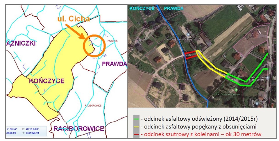 Mieszkańcy Kończyc Północny-Wschód (od Prawdy) dzięki jednemu z zaangażowanych mieszkańców przygotowali dokument dotyczący problemów ze stanem nawierzchni ulicy Cichej, która stanowi jedyny dojazd do tego obszaru Kończyc. Rada przekazał to pismo do gminy wspierając prośby mieszkańców. Skutecznie udało się uzyskać bieżącą naprawę. Stan ulicy Cichej w jej ostatnim odcinku niewątpliwie powinien być przedmiotem dalszych działań, mamy nadzieje, że mieszkańcy tej części przybędą na Spotkanie Wiejski i będzie to przedmiotem osobnej dyskusji. Na uwagę zasługuje podejście mieszkańców, którzy sformułowali problem i przedłożyli go Radzie. Mieliśmy większa łatwość w działaniu. Dziękujemy najbardziej aktywnym za podstawę społeczną.