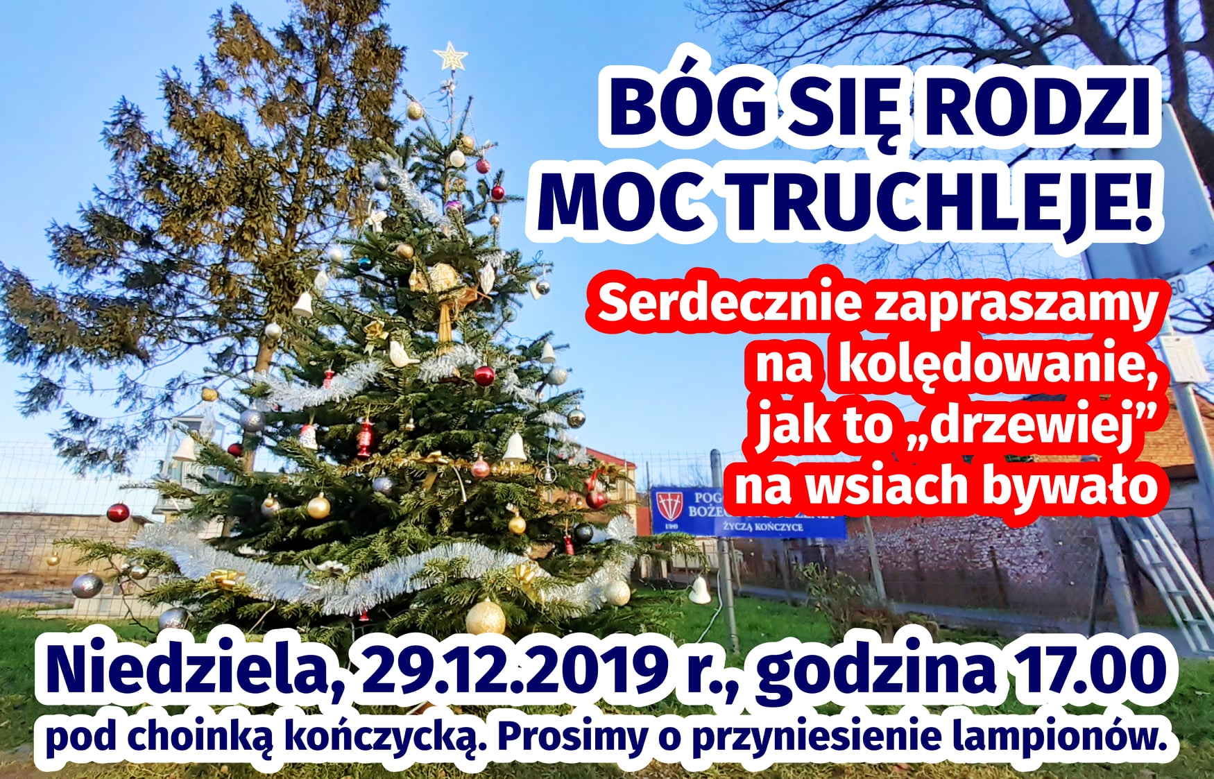 Oddolnie powstała inicjatywa aby w Kończycach przy wiejskiej choince zorganizować kolędowanie!! (Dziękujemy p. Agnieszce!) Po konsultacjach ogłaszamy, że spróbujemy odtworzyć tę piękną tradycję!!! Serdecznie zapraszamy starszych i młodszych, rodziny z dziećmi, dziadków, sąsiadów – wszystkich – na pierwsze (w XXI w.) kończyckie kolędowanie przy wiejskiej choince!