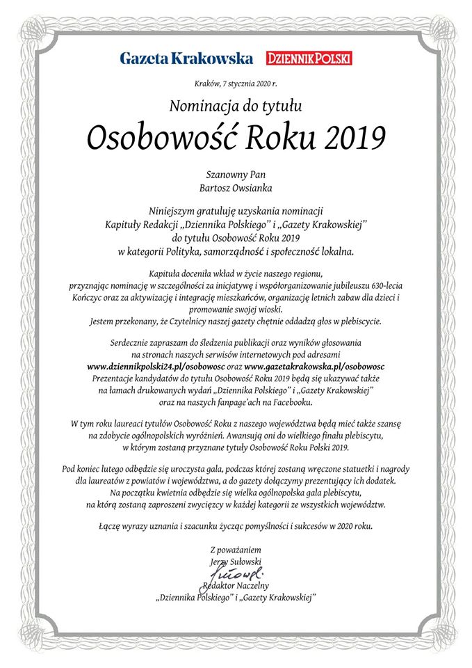 Kochani Mieszkańcy i Sympatycy Kończyc! Stała się rzecz niebywała! Członek naszej Rady Sołeckiej Bartosz Owsianka został nominowany przez kapitułę Gazety Krakowskiej i Dziennika Polskiego do tytułu „Osobowość Roku 2019”.