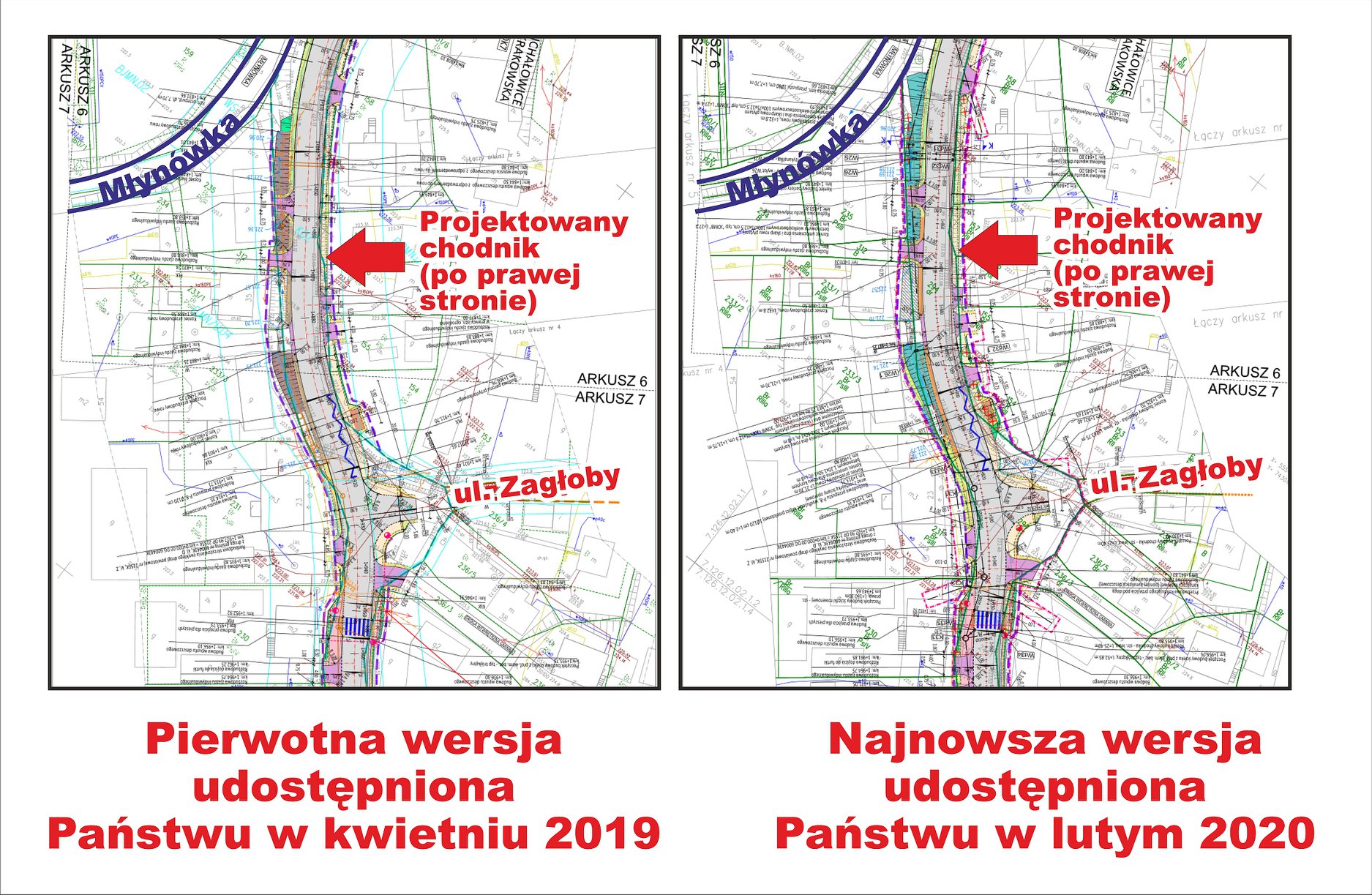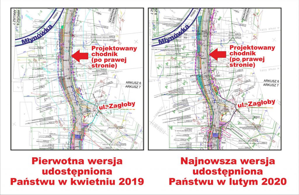 Wyjaśniamy również kwestię, która krąży w przestrzeni publicznej wioski co do zmian przebiegu ścieżki na odcinku – od Kończyce przystanek ku Książniczkom. Prezentujemy wycinki planów, które są dostępne na FB i stronie sołectwa – jeden początkowy z kwietnia 2019, a drugi po poprawkach z lutego 2020. Od początku chodnik był planowany po prawej stronie.