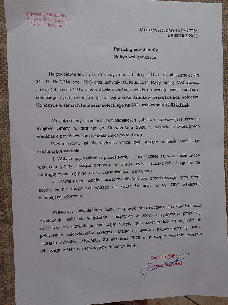 Poniżej prezentujemy informacje z Gminy dotyczącą przyszłorocznego funduszu sołeckiego i jego kwoty na rok 2021. W związku z planowanym na wrzesień Zebraniem Wiejskim w sprawie funduszu na rok 2020 i 2021 prosimy o zapoznanie się z poniższym pismem i przemyślenia w sprawie wydatków. Prosimy inicjatywy mieszkańców (15 osób popierających) skierować do Sołtysa lub członków rady sołeckiej tak, aby zostały wciągnięte do planu zebrania wiejskiego co ułatwi jego organizacyjne i czasowe zaplanowanie. O terminie zebrania poinformujemy osobnym wpisem po ustaleniach terminu tak, aby obecny mógł być Pan Wójt lub w-ce Wójt.