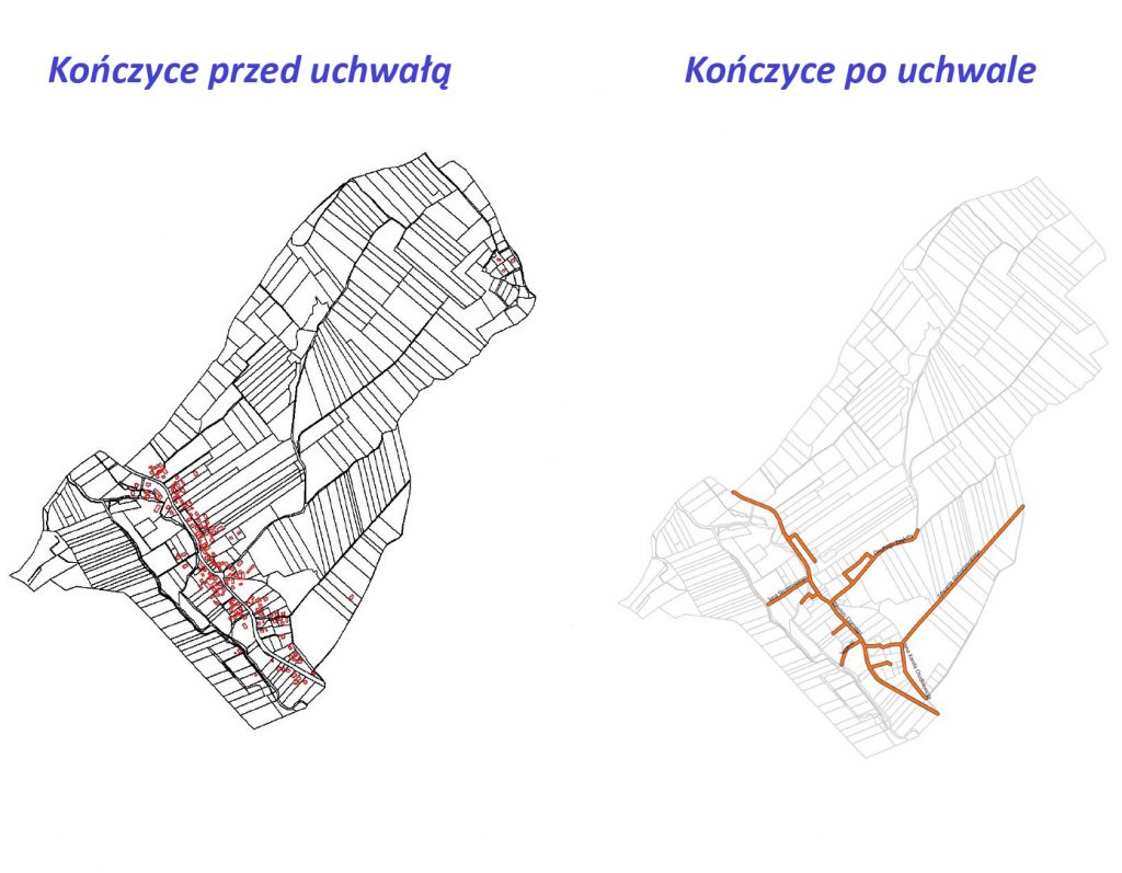 Informujemy równocześnie, iż na Zebraniu Wiejskim sołectwa Kończyce z września 2020 sprawa zmian granic była dyskutowana i jednogłośnie poparta w formie uchwały przez Zebranie Wiejskie (Protokół Zebrania – punkty 9 i 10, Uchwała 3/2020). Poniżej prezentujemy grafiki obejmujące zakres zmian.